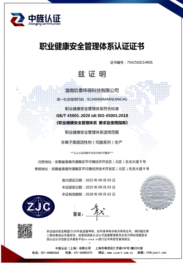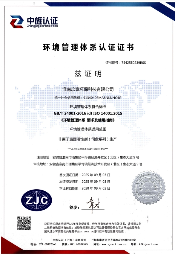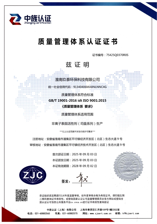 近日,淮南玖泰环保科技有限公司成功通过ISO9001质量管理体系、ISO14001环境管理体系和ISO45001职业健康安全管理体系的现场审核,并于2025年9月3日正式荣获由认证机构颁发的三项管理体系认证证书。